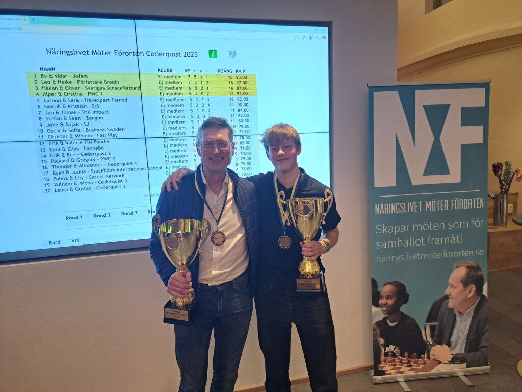 Det blev Familjen Josefssons lag (Jofam) med Bo Börtemark och Vidar Seiger som vann gårdagens Näringslivet Möter Förorten i Stockholm. Silverpokalen togs hem av författaren Leo Brodin och Heike du Plooy och bronset delades mellan PWC med Alper Ataker och Christina Ostafiev och Sveriges Schackförbund med Håkan Östling och Oliver Grace.